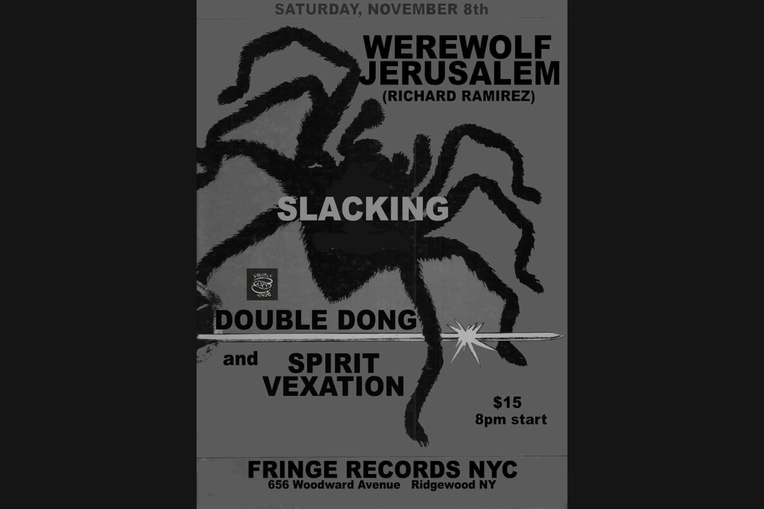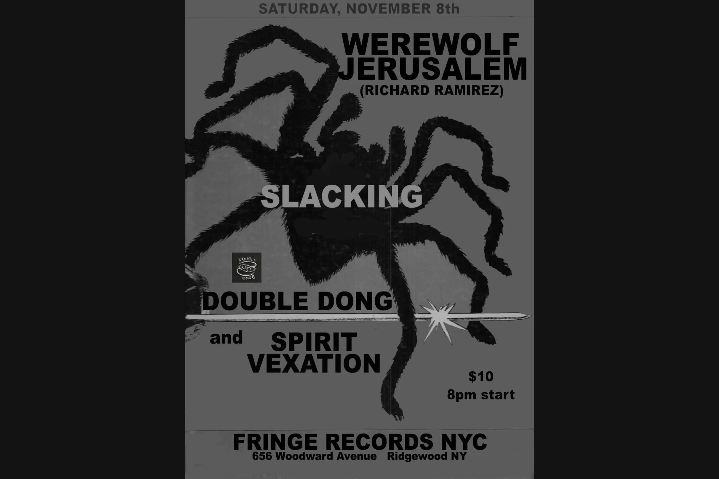 Harsh Noise & Underground Gay Icon Richard Ramirez (also founder of the legendary ‘90s American Noise Label Deadline Records) is returning to NYC for this special one-off gig performing as Werewolf Jerusalem alongside his husband Sean and fellow New York Native Nicky Colucci performing as their new collaborative project, Double Dong (recent cassette released on Hospital Productions). Very pleased to have Slacking perform live here as well! Local support from our friend Spirit Vexation.