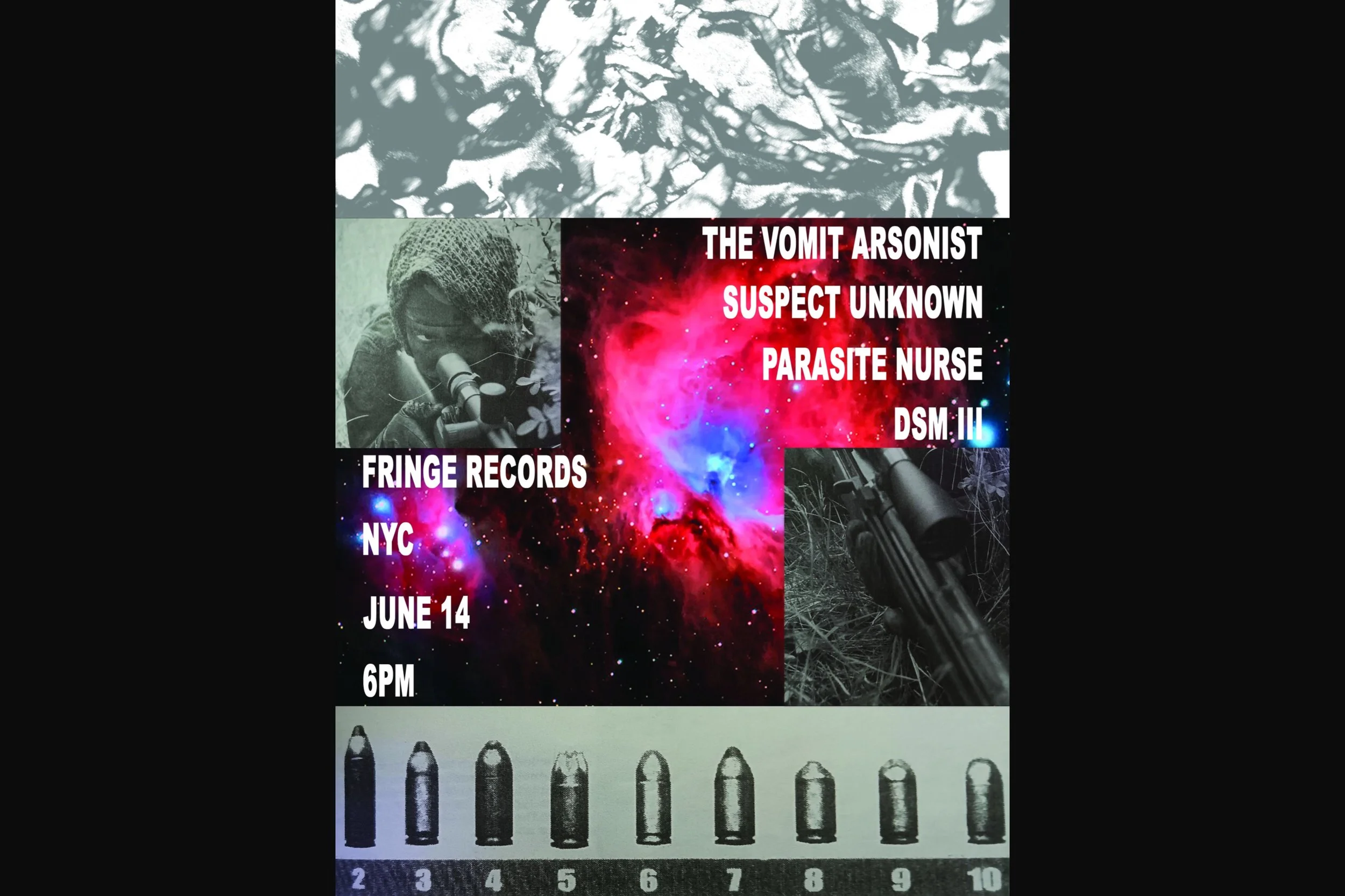 Industrial noise night with a stacked line-up featuring the Vomit Arsonist, Suspect Unknown, Parasite Nurse, & DSM-III.