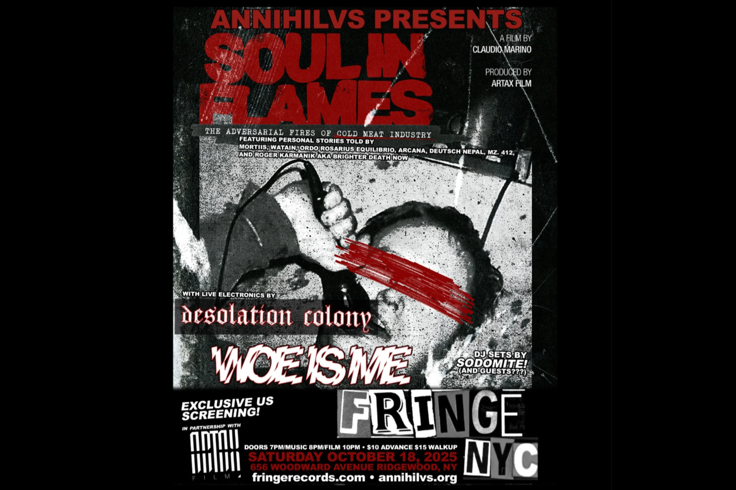 In Conspiracy with Annihilvs Power Electronix, we’re hosting the US EXCLUSIVE Premier for the Cold Meat Industry Documentary, ‘Soul in Flames’, here in NYC! Also featuring live performances from Woe is Me & Desolation Colony.